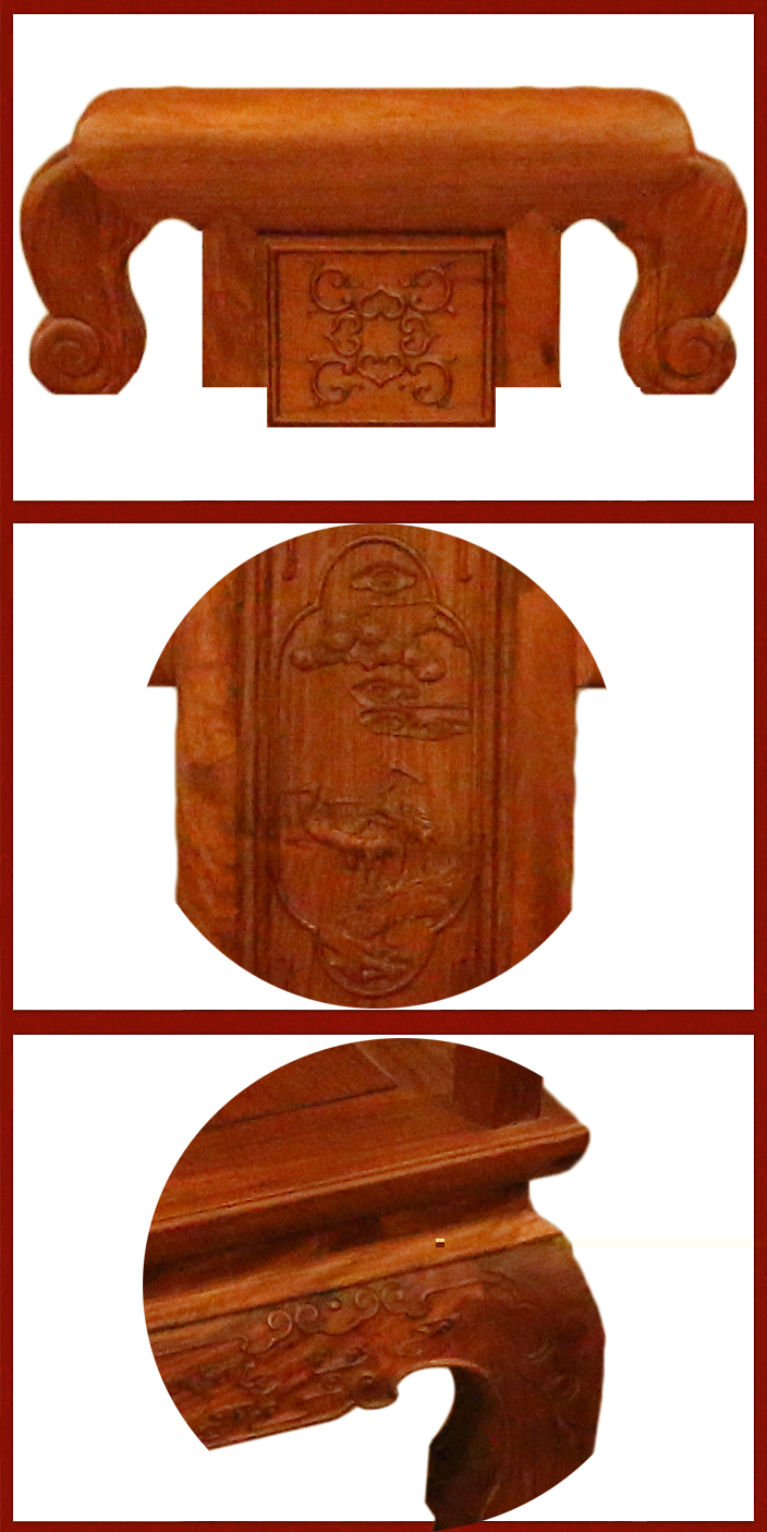 從上往下看,正面,呈直線狀的椅靠背板頂部,左右兩處各相接一尾彎角圓弧以及底部呈祥云內(nèi)環(huán)繞形態(tài)的底腳,分別駕于下處兩截木條之上,給人一種閑庭屹立之感,頗顯意味沉韻;