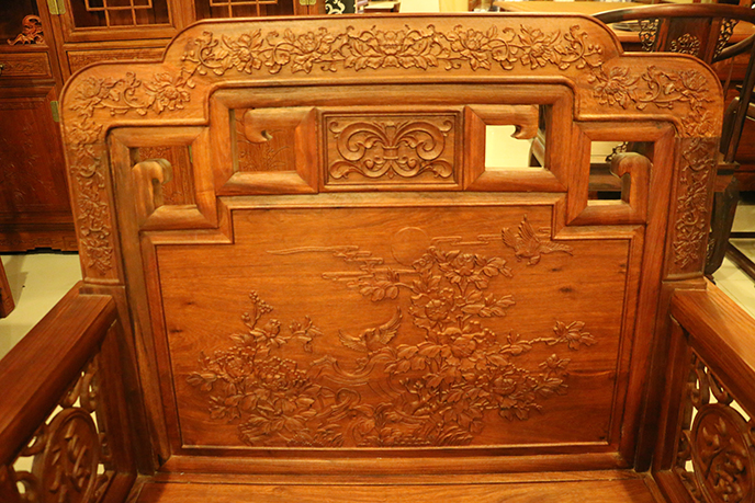 第三是中國的語言,它是紅木家具中出現(xiàn)頻率最高的圖案,福字紋、萬字紋、喜字紋、壽字紋,工匠們喜歡用文字來表達自己的美好祝福,給居室多增添生活氣息,掩蓋紅木家具給人的硬朗、威嚴的感覺。除了單個字體的文字外,其椅背等處還多見一些短語、警句、吉祥語或詩句,它們經(jīng)過特殊的美化變形處理后,也極具觀賞價值。