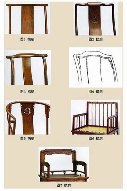 明清家具部件名稱。椅子、衣架等位于家具最上的橫梁叫“搭腦”。如明式椅子中最典型的搭腦有馬鞍式、挖油盞頭式、圓便直式、駱駝背式和天宮翅式等。造型千變萬化,但都具有流暢、挺秀的特點。
